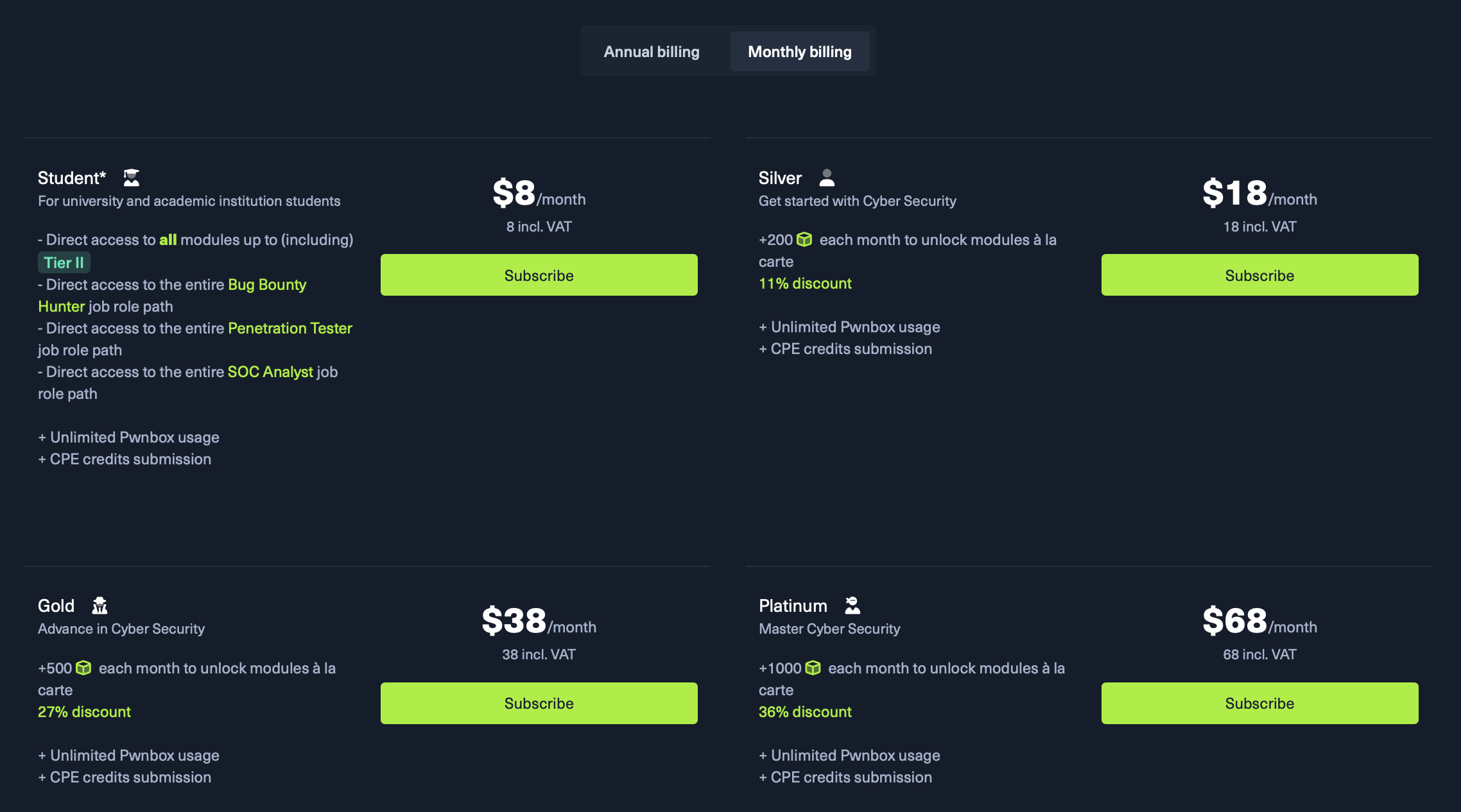 The SOC Analyst path is available at HTB Academy platform and fortunately there are multiple afforable subscription models for different users. I used their student subscription which is only $8 per months if you have a .edu email. This will give you access to all the modules in the SOC Analyst path, the pre-requisites path and even access to all their main certifications paths (CPTS, CBBH and CDSA).